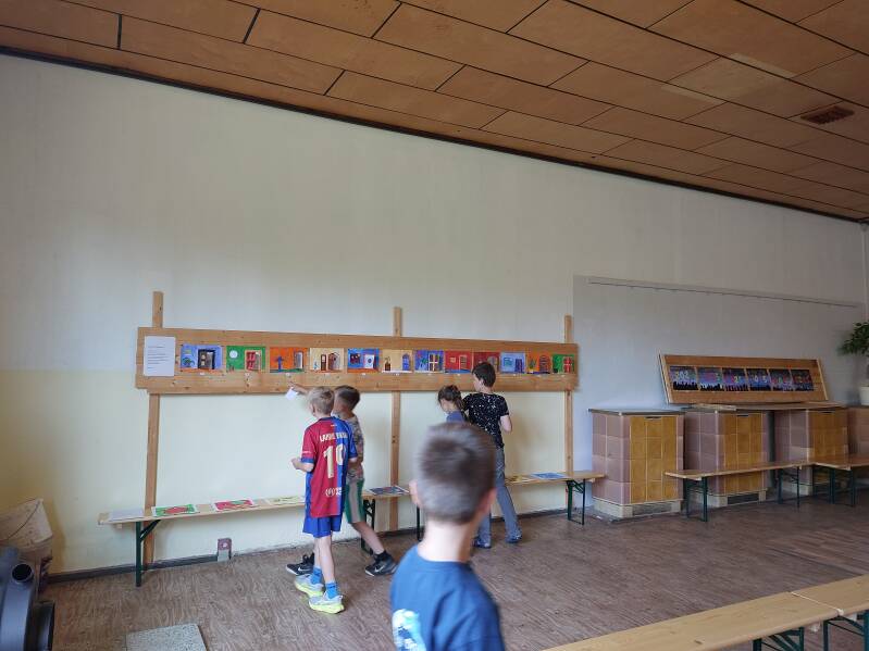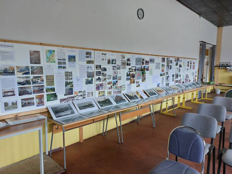 Ausgestellte Fotos und Zeichnungen im großen Raum des Gemeindezentrums